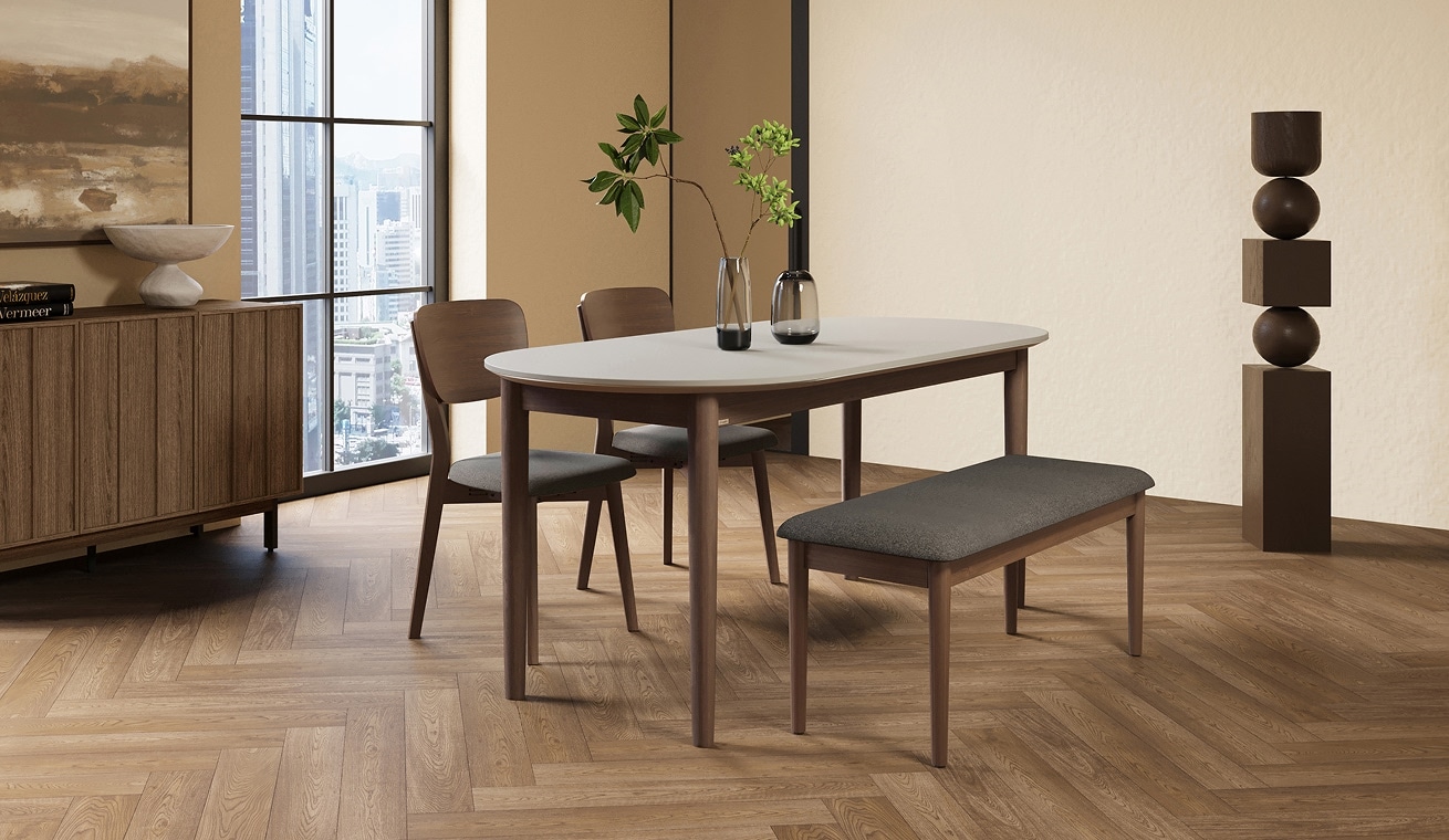 포멜로 세라믹식탁 4인세트 160cm 브라운_벤치1100 1EA, 가죽체어 2EA